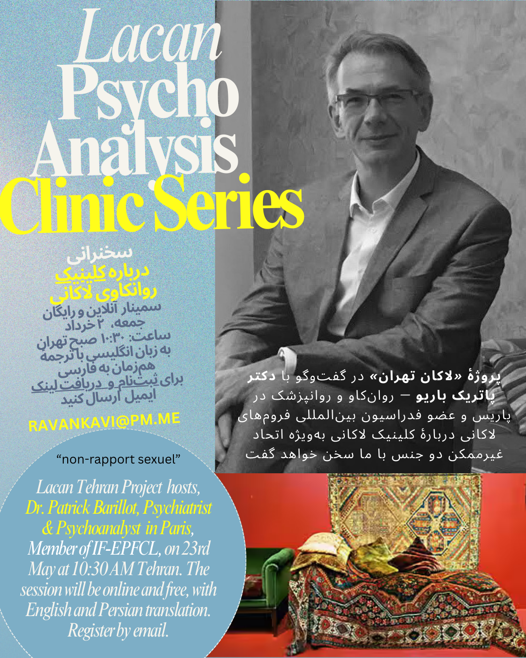 On 23rd May the new Lacan Tehran Project will host Dr. Patrick Barillot, psychiatrist and psychoanalyst in Paris and a Member of the IF-EPFCL, for a talk on the sexual non-rapport. The event is free and open to all and will be conducted in English with Persian translation. Register via the email address in this flyer. The Lacan Tehran Project is an independent space for dialogue, education, and research in the field of psychoanalysis, with a particular focus on the Freudian-Lacanian tradition. By inviting leading psychoanalysts, researchers, and professors, the project organizes a series of seminars, lectures, study sessions, and research groups that explore the connection between psychoanalysis, culture, the clinic, language, and contemporary issues. The Project’s sessions are held online in both Persian and English, allowing for the presence of audiences from different cities and countries. Simultaneous Persian translation is planned for most events. The Lacan Tehran Project also invites interested parties to participate in research groups. These groups focus on reading foundational texts of psychoanalysis, including the works of Sigmund Freud, Jacques Lacan, and contemporary psychoanalysts. For more information, to register for seminars, or to join a research group, get in touch via the contact details in the flyer linked to above.
